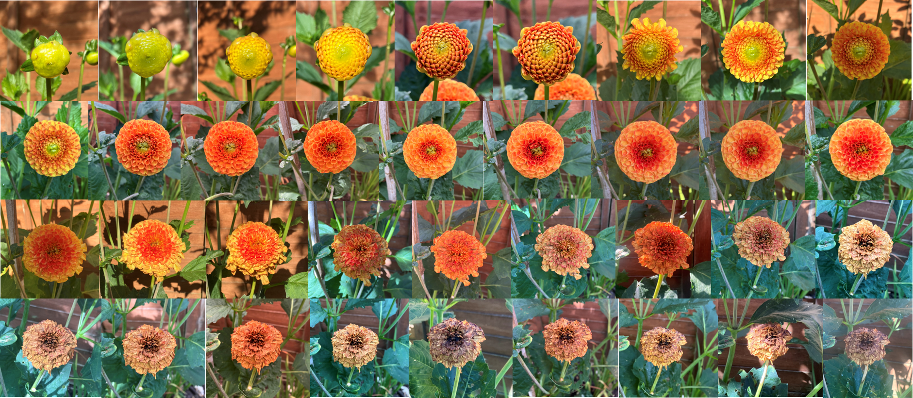 New dahlias were starting to bloom, a different variety to the ones that came out earlier in the season, and I was astonished by the intricacy of their unfolding. Starting as tight green spheres, edges slowly open origami triangles of red and orange, a scaled dragon-eye left at the centre, before finally opening to a concertinaed circle of petals. (Surely these must be the inspiration behind paper pom poms?) So incredibly neat and ordered. The second law of thermodynamics may say that time flows towards disorder, but I feel these dahlias are mocking any attempt to neatly box up any ‘law’ of time. They bloom into symmetry not just once, but over and over, with each new bud through the year, then repeated again the following year, and the next… So captivated by this origami-esque flower, I’m inspired to take daily pictures of the opening buds, to visualise this miraculous unfolding over time.